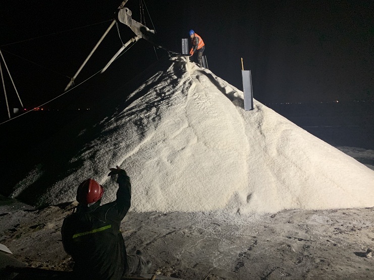 3月3日上午,埒南制鹽15個生產班組共出動5臺扒鹽機組投入春扒工作,截止3月9日,5臺機組共計扒完結晶池51塊,共扒原鹽2.5萬余噸。