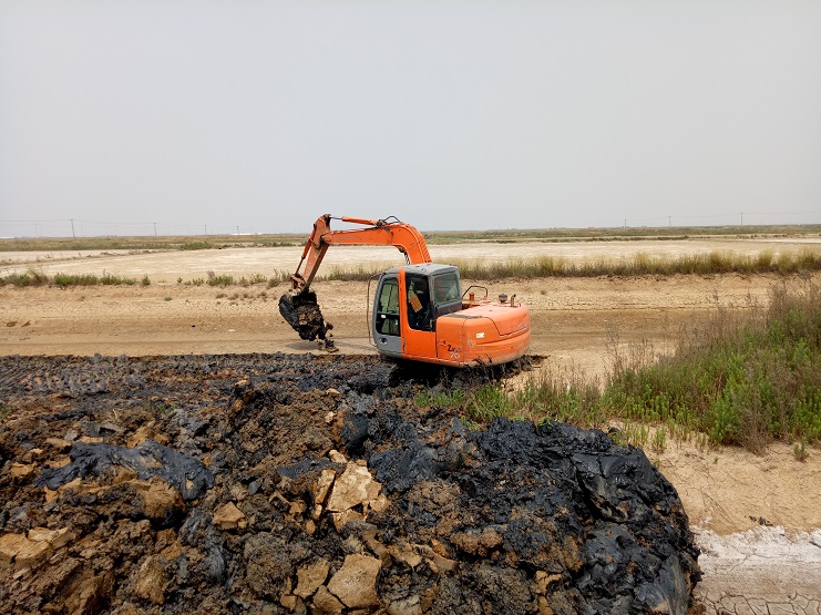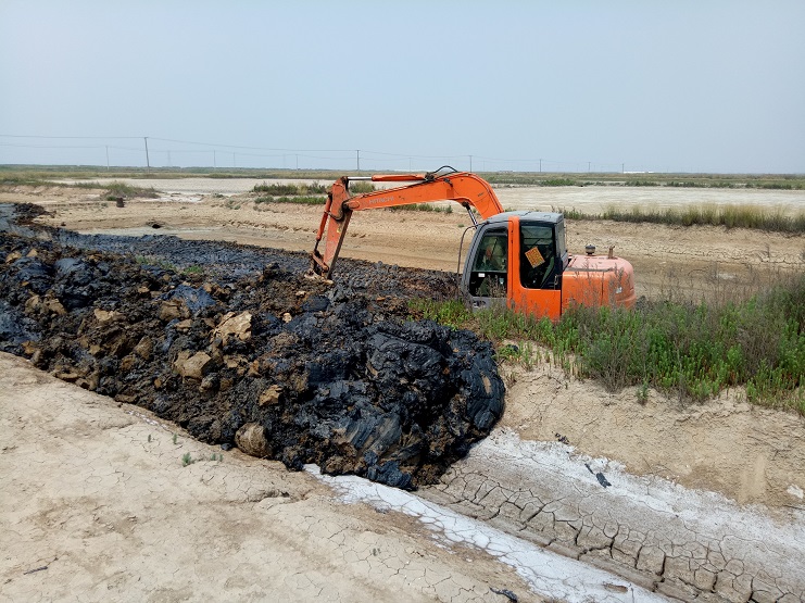 海鹽基地一班班組近日對土塘進行清淤改造。兩臺挖掘機頂著連日來的高溫天氣連續工作?,F該班班組的三排土塘清淤改造工作基本完成。(實業公司)